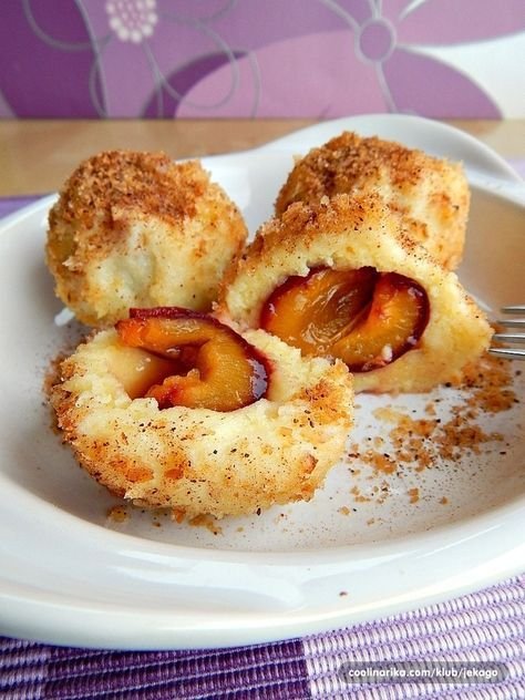 Soft potato dumplings filled with plums, coated in buttery breadcrumbs, and lightly dusted with powdered