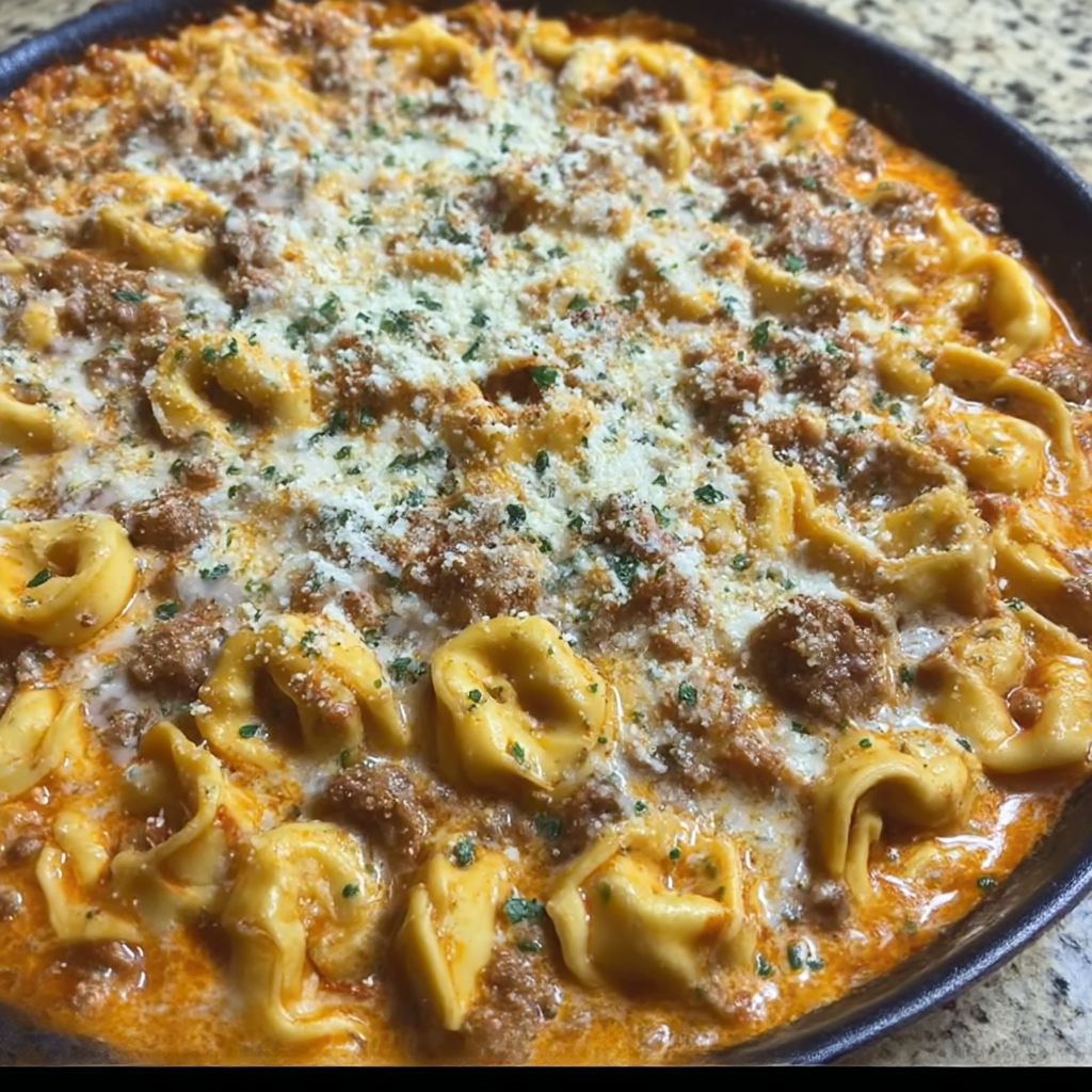 This Creamy Italian Sausage Tortellini combines the convenience of frozen pasta with Italian sausage in a rich dual-sauce base that merges Alfredo and marinara for complex flavor. The recipe creates a complete meal in a single skillet, with the tortellini cooking directly in the sauce to absorb maximum flavor. The finished dish is topped with melted mozzarella cheese, creating a satisfying comfort food meal that’s ready in just 25 minutes.