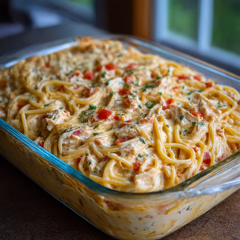 Creamy Rotel Chicken Spaghetti Casserole
