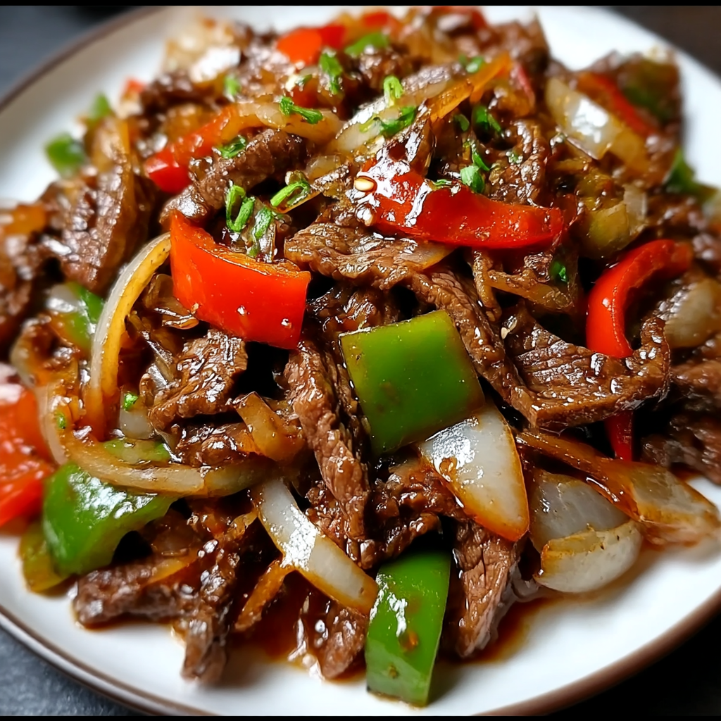This Chinese-inspired pepper steak delivers authentic Asian flavors through tender marinated beef strips stir-fried with crisp vegetables in a glossy, savory sauce. The dish combines succulent sirloin with vibrant bell peppers, sweet red onions, and fresh tomato wedges, creating a perfect balance of textures and tastes that’s ready in under